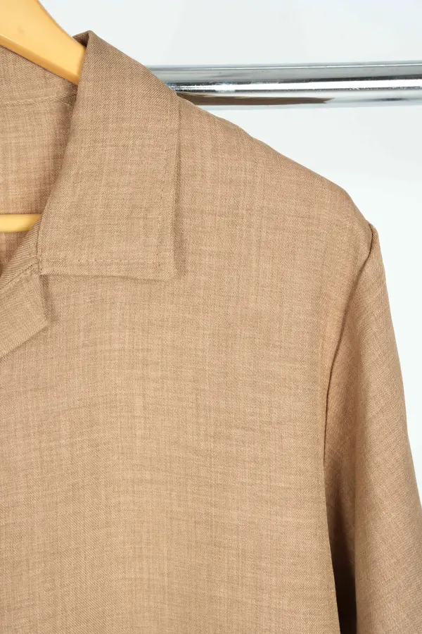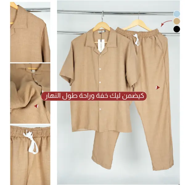 Cet ensemble en style lin combine confort, respirabilité et allure moderne pour un look propre et détendu.